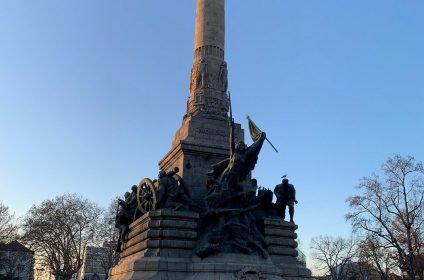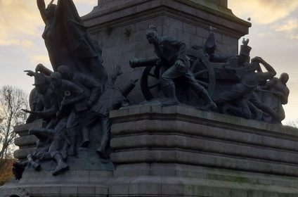 At the base of the figure there are figures of soldiers and scenes of facts linked to the Napoleonic wars, in reliefs carved in granite. Two dates, in bronze, like all the sculpture, can be seen on two fronts of the base of the column: MDCCCVIII and MDCCCIX. Still on the pedestal, the city’s weapons are placed.